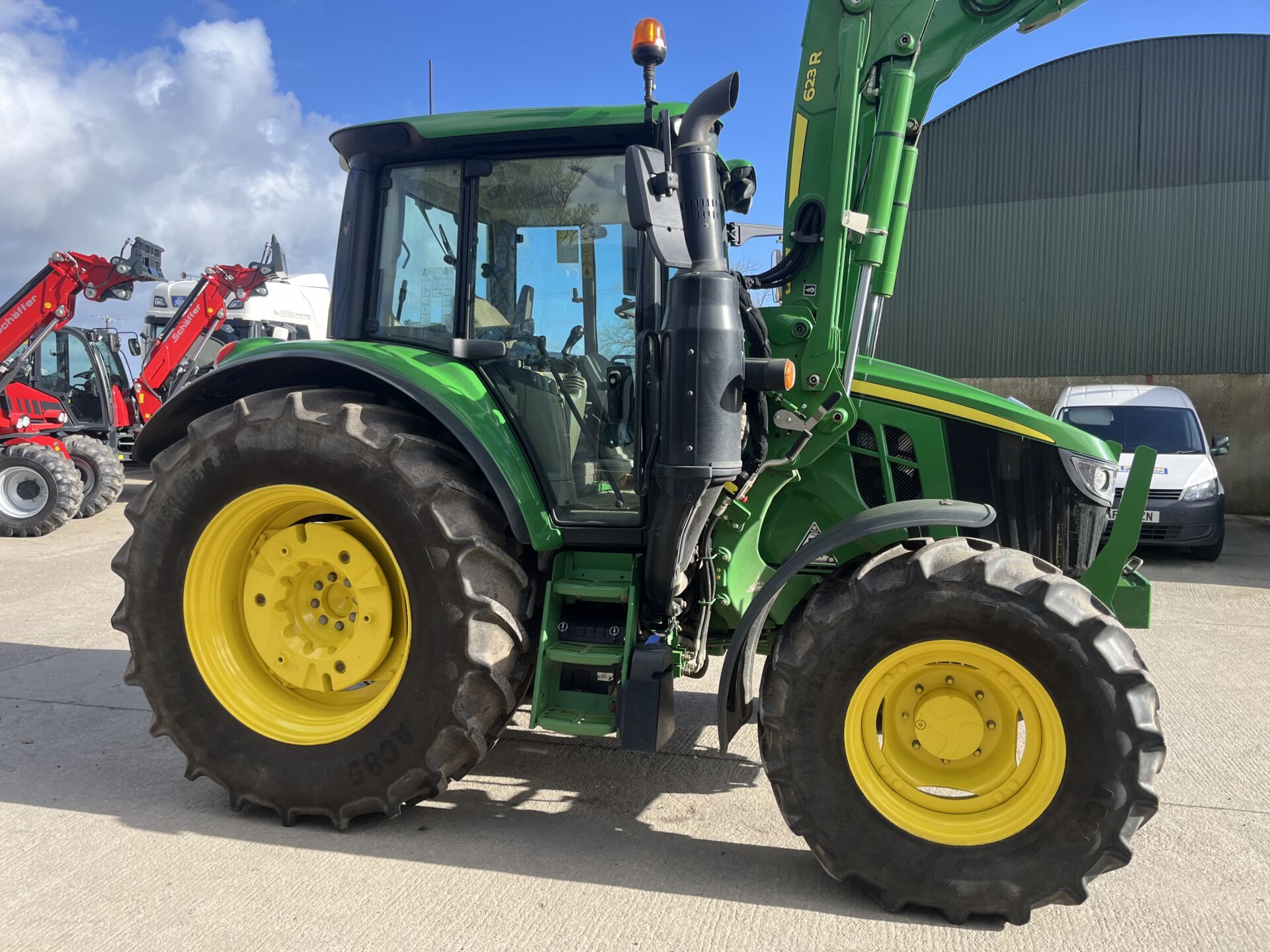 2022 JOHN DEERE 6120M WITH 3100 HOURS. C/W FACTORY FITTED JOHN DEERE 623R LOADER. TRACTOR HAS A 40KPH AUTO-QUAD GEARBOX WITH THE FORWARD-REVERSE GEAR-CHANGE FUNCTION ALSO ON LOADER JOYSTICK, FRONT TLS SUSPENSION, 2 MANUAL SPOOLS WITH THE 3RD SPOOL ON BUTTON TO OPERATE TELESCOPIC HITCH, HIGH FLOW HYDRAULIC PUMP, REAR WHEEL WEIGHTS, BIG MIRRORS, AIR SEAT, AIR CON, PASSENGER SEAT ETC…