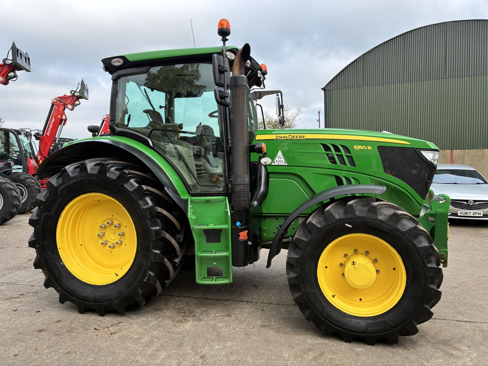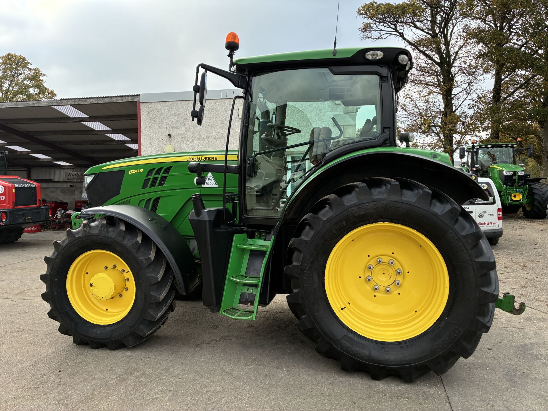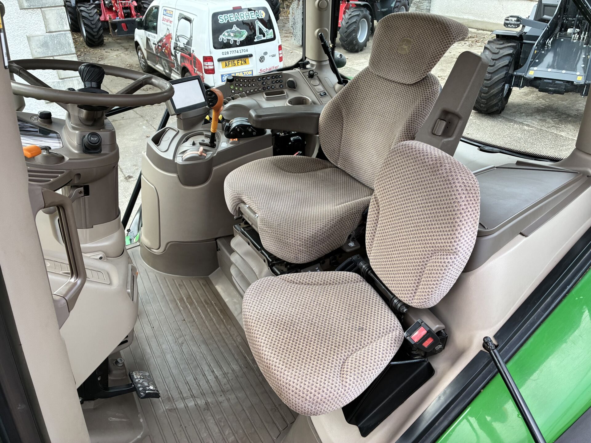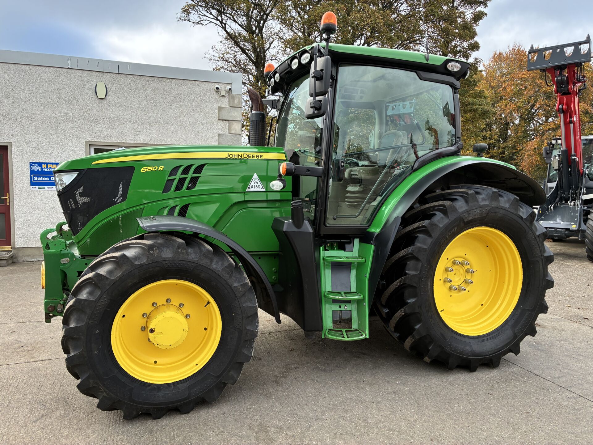 2014 JOHN DEERE 6150R WITH 9850HRS, 50KPH AUTO QUAD GEARBOX, AIR BRAKES, 3 SPOOLS, FRONT LINKAGE & PTO, TELESCOPIC HITCH ON SEPERATE SPOOL / SWITCH, LOAD SENSING HYDRAULICS, WIDE ANGLE MIRRORS, EXTRA WORKLIGHTS PACKAGE, TWIN FLASHERS, AIR / HEATED DRIVERS SEAT, PASSENGER SEAT, AIR CON, SUNROOF, FILED OFFICE, CB RADIO ETC… NEW ALLIANCE 650/65/38 REAR & 540/65/28 FRONT TYRES.